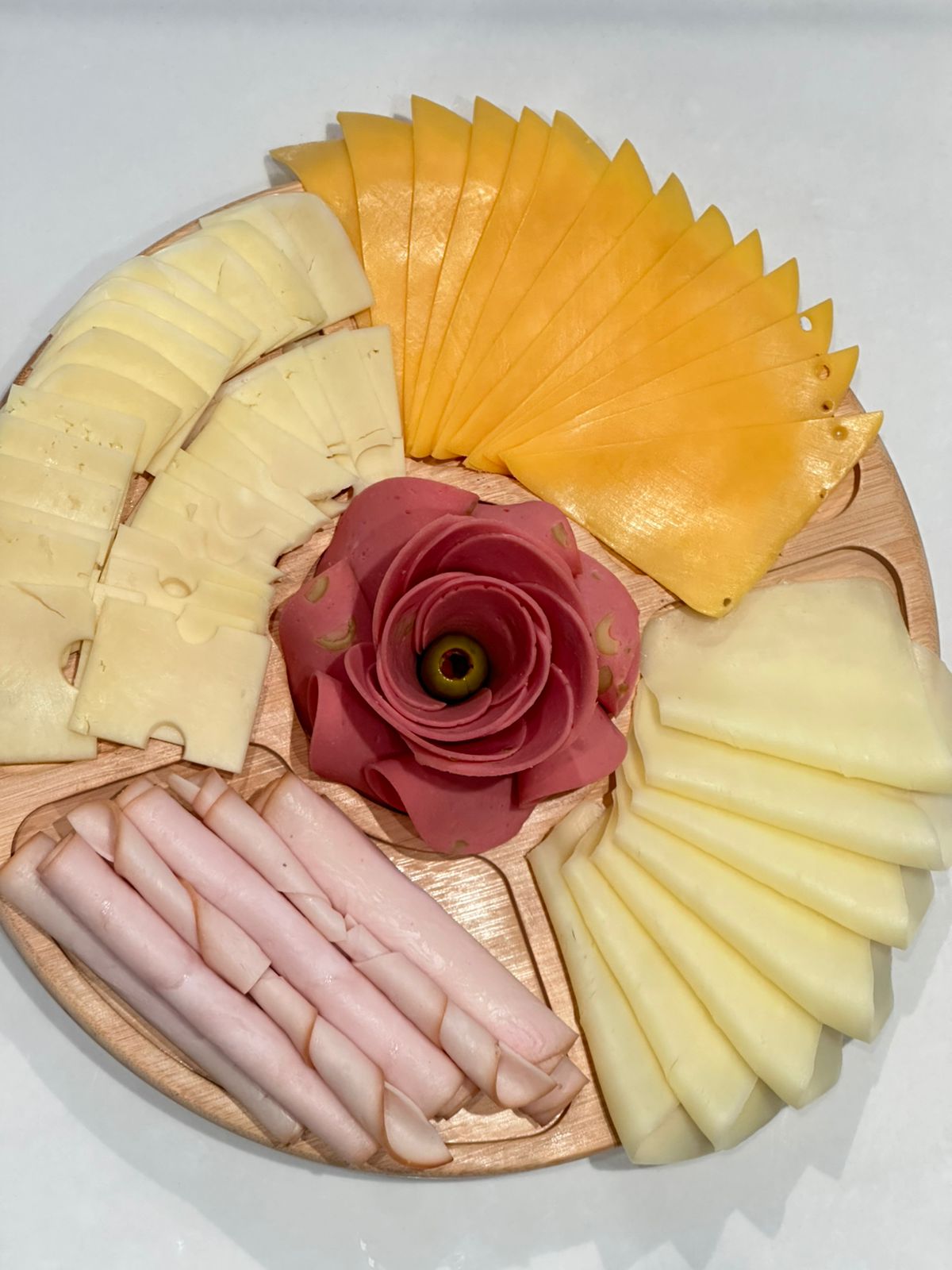 Beef mortadella with olives- Smoked turkey breast- Kashkaval cheese- Cheddar cheese- Emmental cheese- Sourdough bread